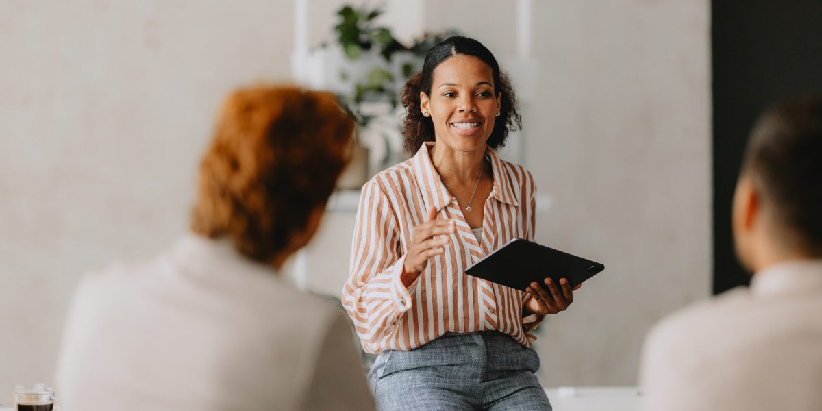 Confident businesswoman leading a group business meeting at a bright beige office. Professional interaction and teamwork concept.