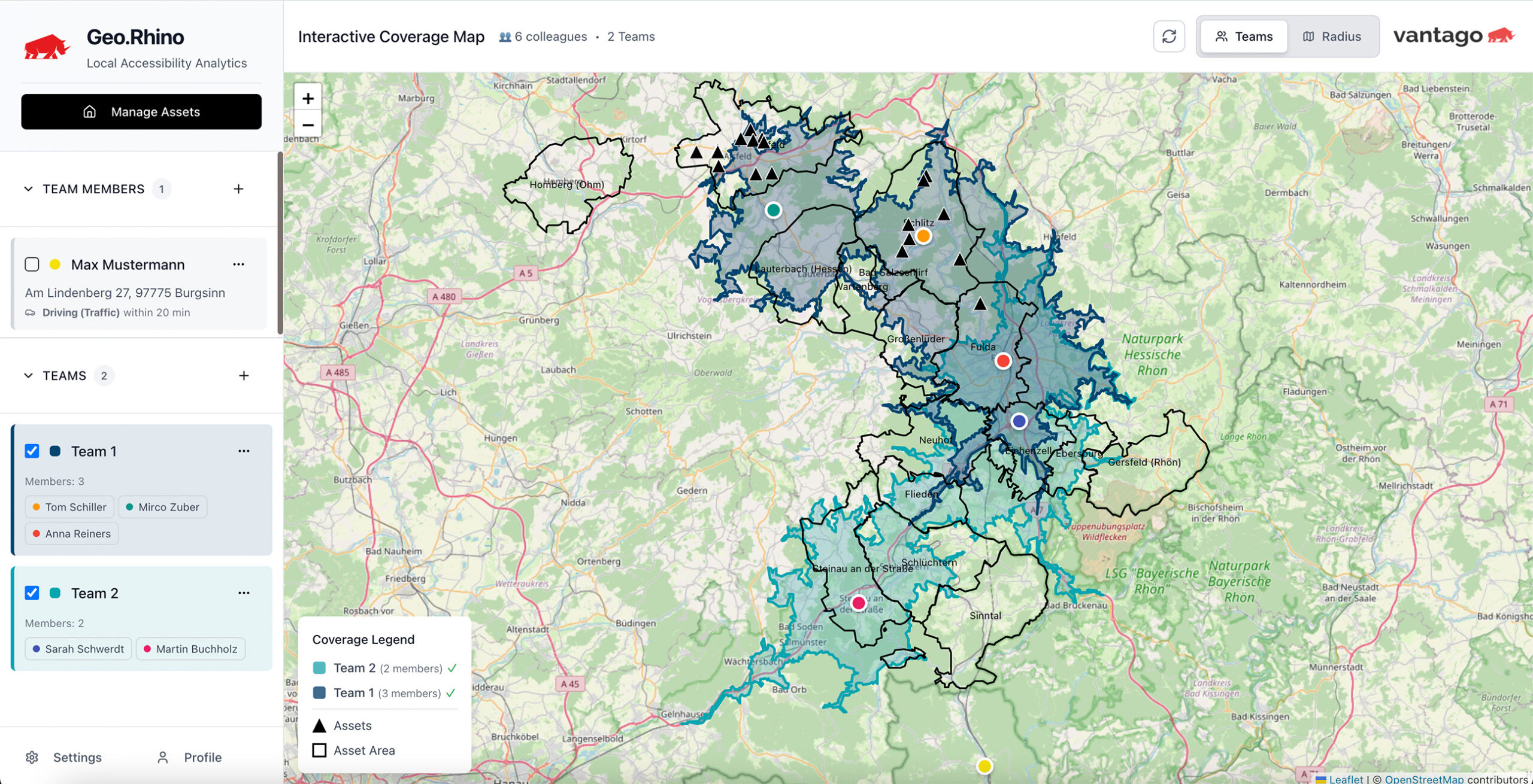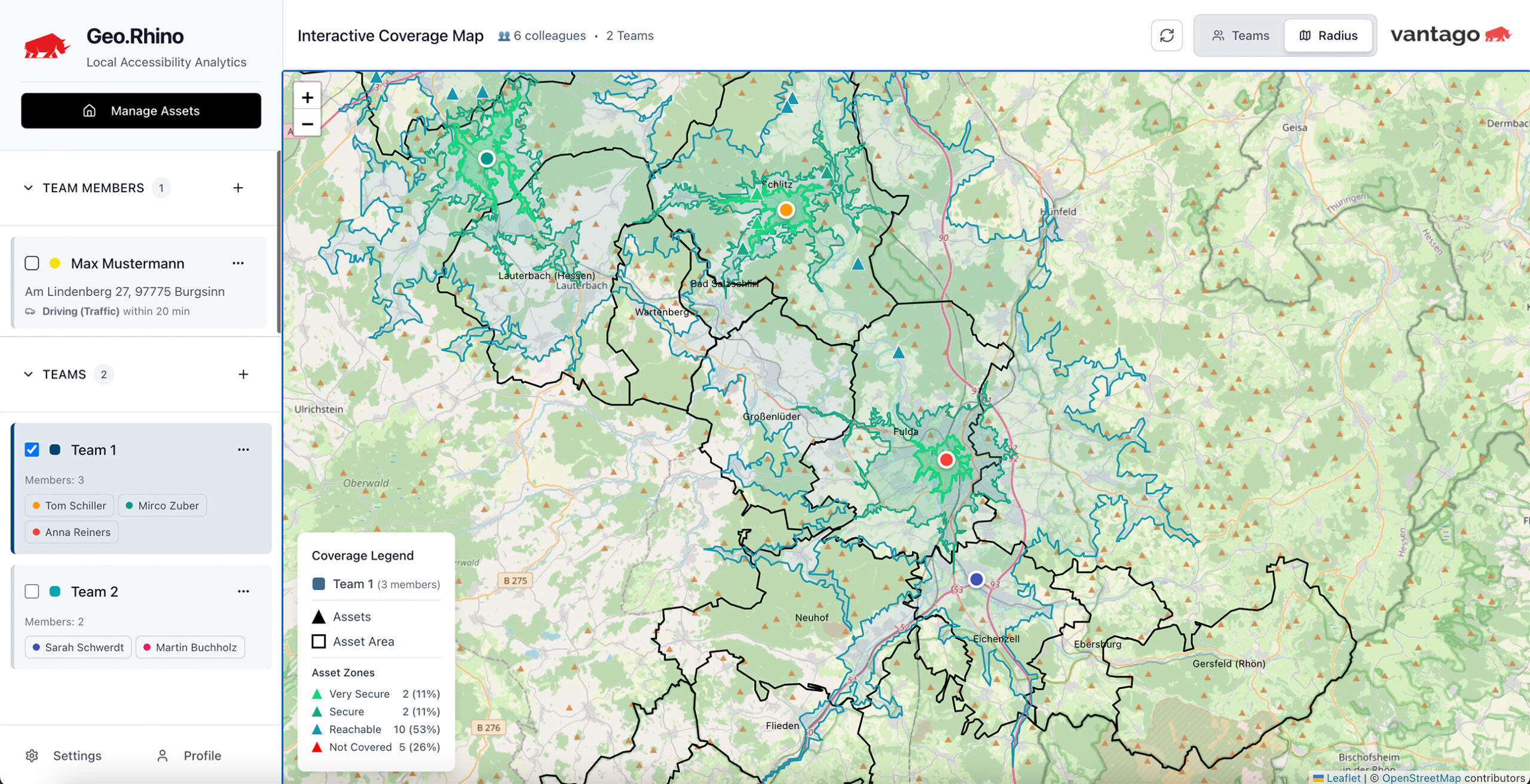 Geo.Rhino simuliert Teamkonstellationen, reale Wegezeiten und Szenarien. So können verschiedene Bereitschaftsmodelle verglichen und die robusteste Konstellation identifiziert werden. Die Grundlage, damit Ihr Netzgebiet stets zuverlässig abgedeckt ist.